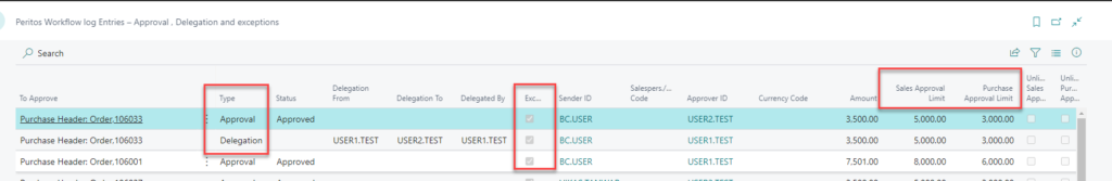 You set up approval workflows on the workflow page. You must also set up approval users, including any relevant payment limits, on the approval user setup page. This process can work for both sales and purchasing. In the Peritos Delegation app we take into consideration a configuration option for the user to select if exception logging is to be enabled.