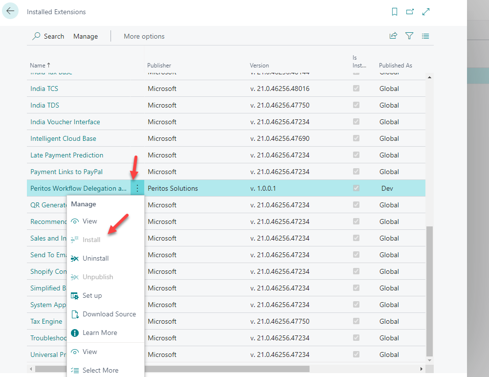 In Dynamics 365 Business Central, use search to open the Extension Management page.