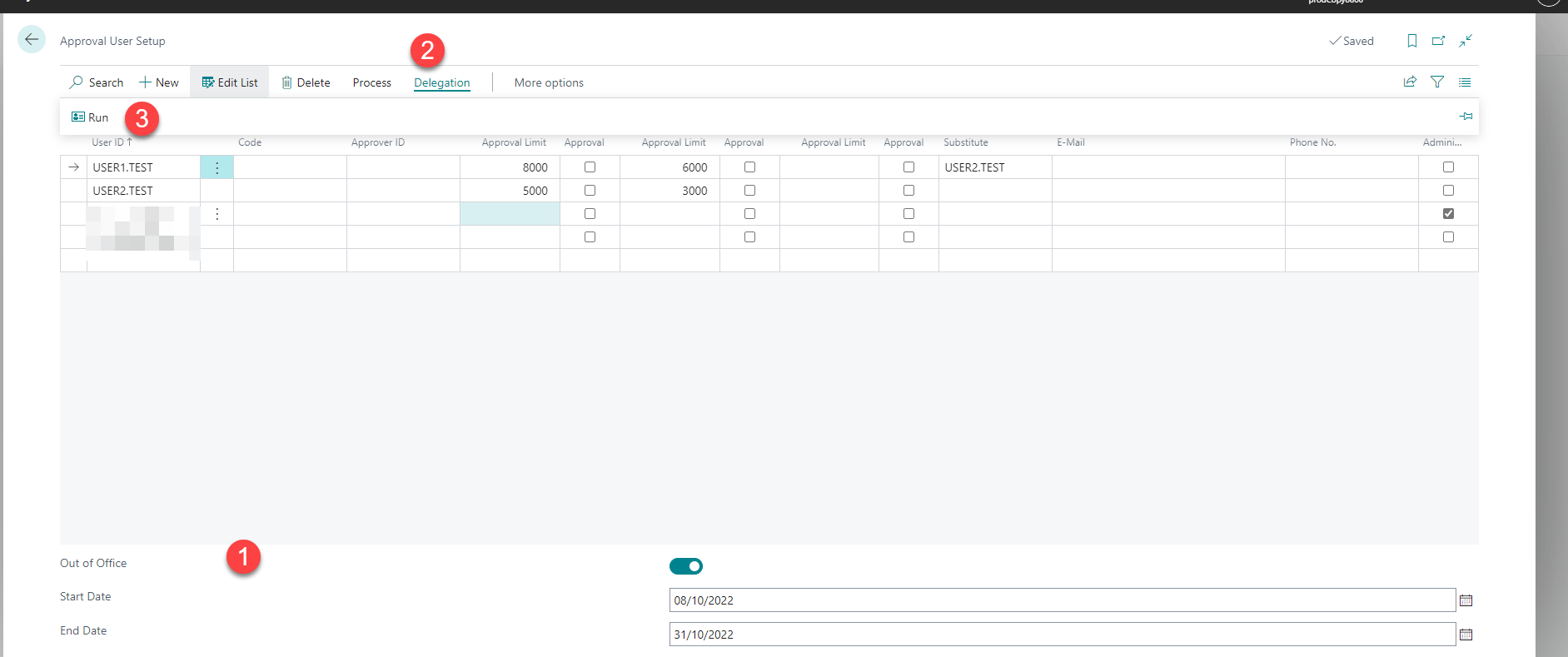 After enabling the first option delegation allowed in the previous step starts functioning; if a user is planning to go out of the office, it should be added in the Approval user setup with start and end date as indicated below.
