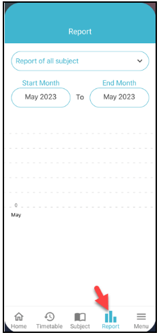 Go to the “Report” tab on the Be-Present app to access attendance history. View overall and subject-specific percentages and session details like attendance and conducted sessions. Specify the start and end months for a custom report.