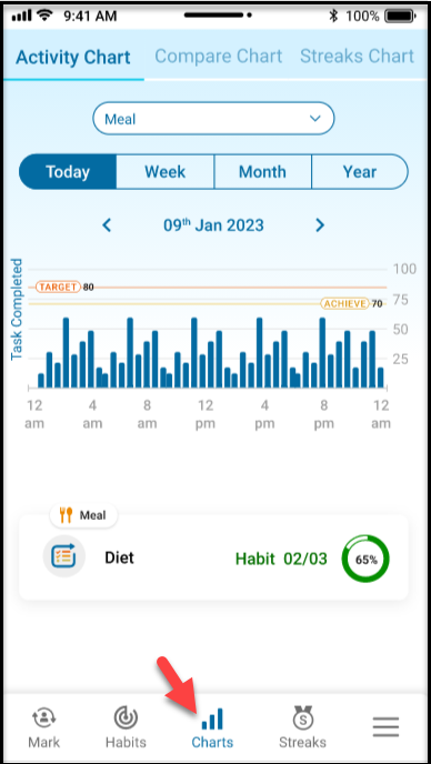 The Habit Tracker app has a ‘Chart’ tab that offers detailed habit analysis. The ‘Activity, Compare & Streaks Chart’ shows daily, weekly, monthly, or yearly data. Use it to visualize activity, track streaks, and optimize strategies for successful habit management. Embrace this feature and gain valuable insights for successful habit management.