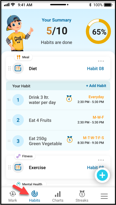 To keep a trail of your daily, weekly, or monthly habits, use the “Habits” tab to organize them as needed. Customize the recurrence pattern of each habit to set the target required for your goals, hourly, daily, or weekly. You can repeat this process for multiple habits. You can (use the ‘+’ sign to) add or (Delete option to) delete any habit from the app as and when you feel, under various Categories and Types, such as Fitness, Mental health, Work, etc.