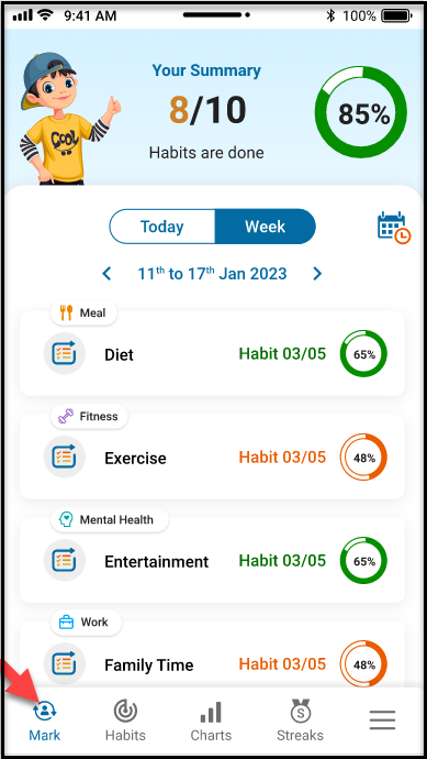 Our Habit Tracker app helps you track habits easily and accurately with the ‘Mark’ tab. You can view daily or weekly progress and stay accountable by tracking your target percentage or amount achieved. Establish routines and break bad habits with self-awareness and progress tracking.